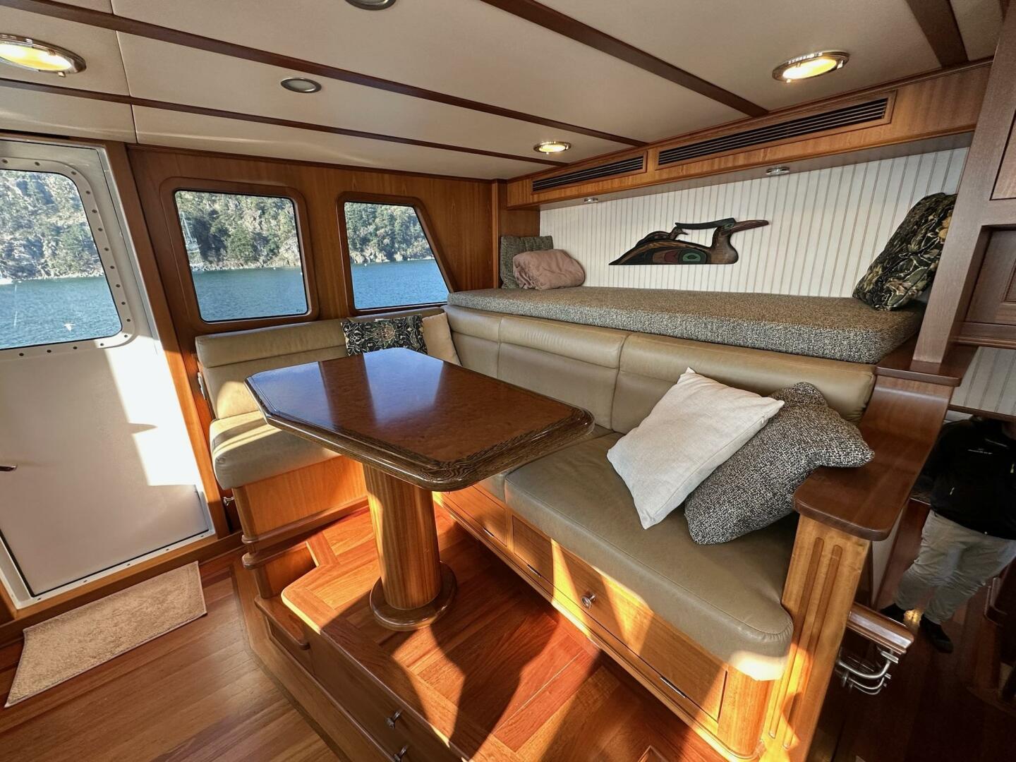 A large covered deck aft extends forward past a curved settée and service bar to broad side decks surrounding the spacious saloon, where there's enough room for a separate dining area, served by a commercial-grade galley.